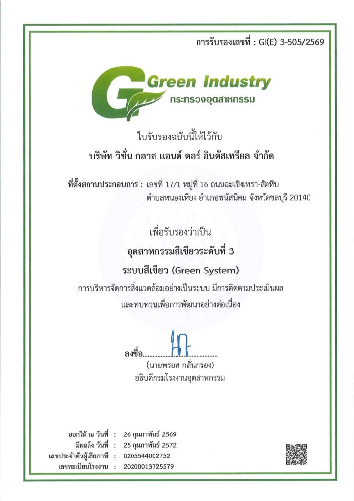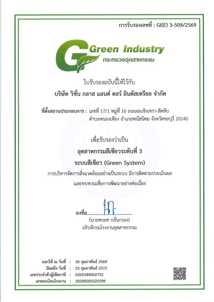 บริษัท วิชั่น กลาส แอนด์ ดอร์ อินดัสเทรียล จำกัด ได้รับการรับรอง อุตสาหกรรมสีเขียว ระดับ 3 (Green System) จากกระทรวงอุตสาหกรรม โดยมีการบริหารจัดการสิ่งแวดล้อมอย่างเป็นระบบ มีการติดตามประเมินผล และทบทวนเพื่อการพัฒนาอย่างต่อเนื่อง