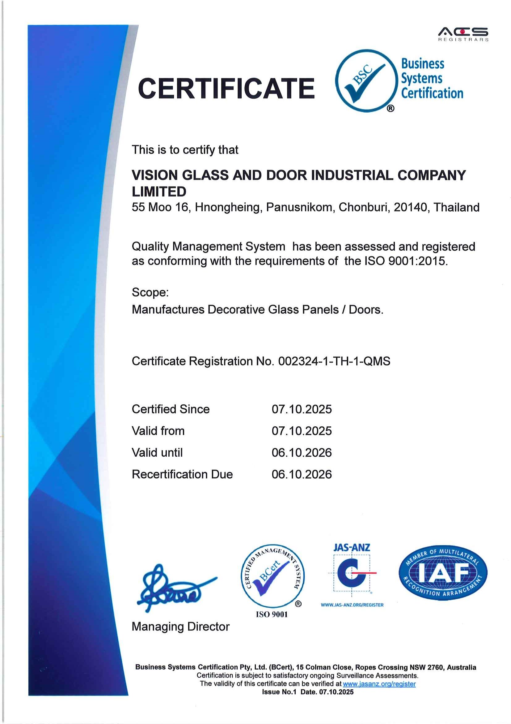 บริษัท วิชั่น กลาส แอนด์ ดอร์ อินดัสเทรียล จำกัด ได้รับการรับรอง อุตสาหกรรมสีเขียว ระดับ 3 (Green System)
